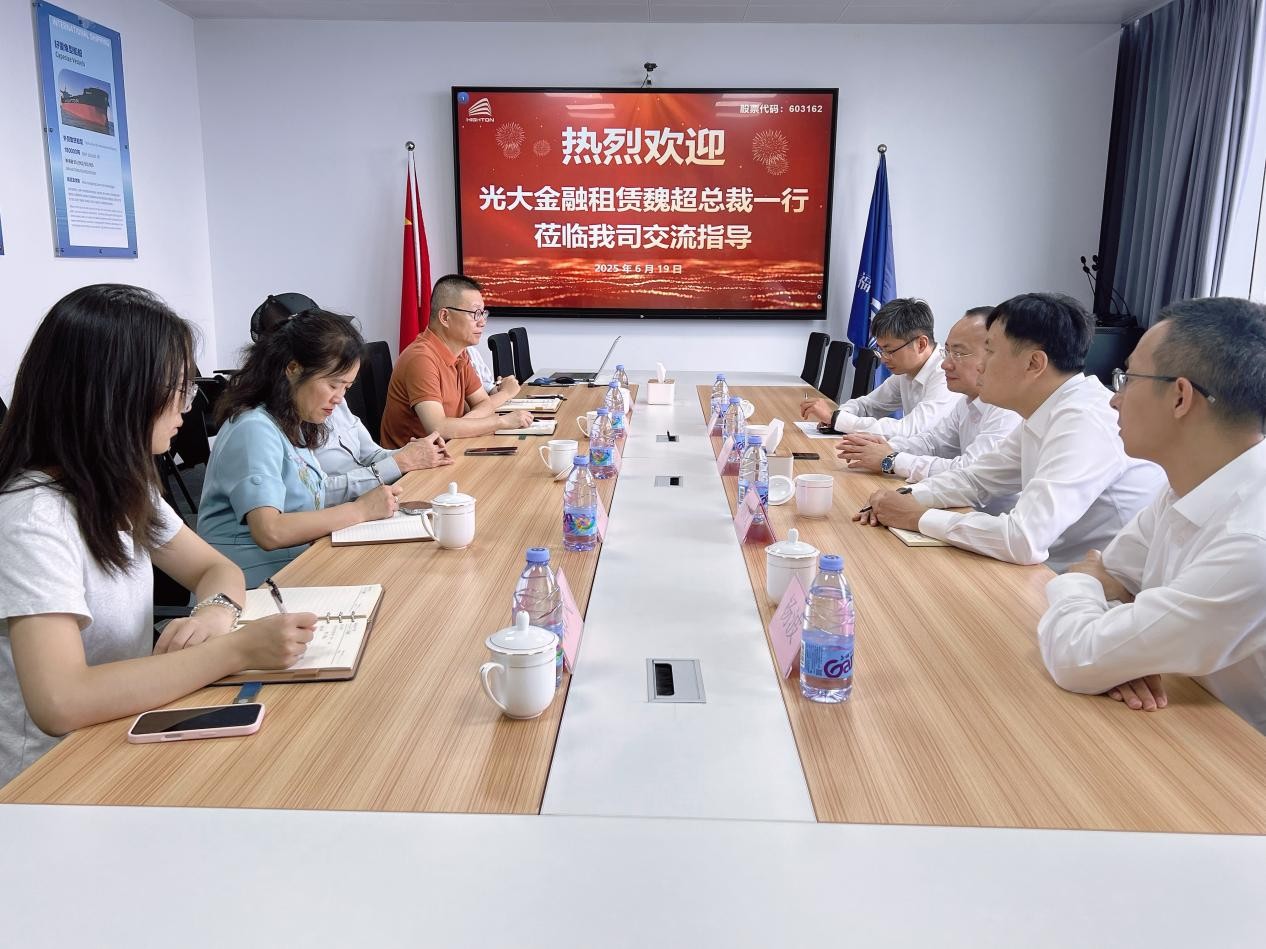 6月19日,光大金融租賃股份有限公司總裁魏超一行蒞臨海通發(fā)展開展業(yè)務(wù)交流。雙方圍繞船舶經(jīng)營性租賃、市場前景及國際形勢等議題展開深入探討。海通發(fā)展董事長曾而斌,副董事長、總經(jīng)理鄭玉芳,董事、副總經(jīng)理、財務(wù)總監(jiān)劉國勇等人熱情接待并參與座談。
