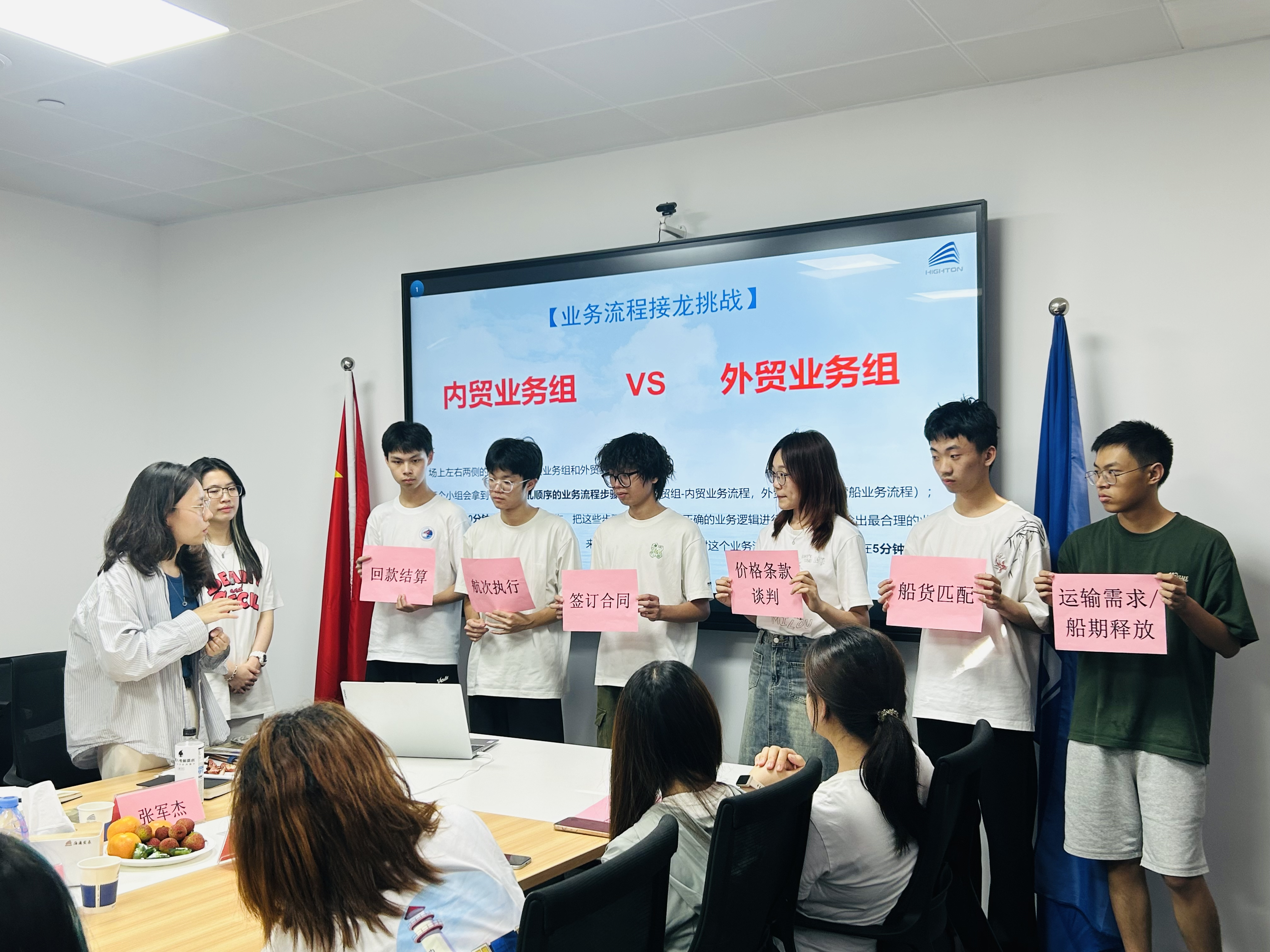 為加深學(xué)生對干散貨業(yè)務(wù)的理解,由海大優(yōu)秀校友擔(dān)任專業(yè)導(dǎo)師,學(xué)生們進(jìn)行內(nèi)外貿(mào)業(yè)務(wù)流程接龍?zhí)魬?zhàn)互動環(huán)節(jié),18名學(xué)生分為內(nèi)貿(mào)業(yè)務(wù)、外貿(mào)業(yè)務(wù)兩個小組,在10分鐘內(nèi)完成業(yè)務(wù)流程排序與梳理。展示環(huán)節(jié)中,同學(xué)們通過流程碎片展示和現(xiàn)場解說,生動呈現(xiàn)了航運(yùn)業(yè)務(wù)的關(guān)鍵節(jié)點(diǎn)。學(xué)長學(xué)姐們對學(xué)弟學(xué)妹們進(jìn)行糾錯指導(dǎo),同時(shí)系統(tǒng)講解了實(shí)際業(yè)務(wù)中的操作規(guī)范與要點(diǎn)。這種"實(shí)踐-展示-指導(dǎo)"的教學(xué)模式,有效幫助同學(xué)們將理論知識與實(shí)務(wù)相結(jié)合,助力學(xué)生更準(zhǔn)確、深刻地掌握整體業(yè)務(wù)邏輯,提升認(rèn)知效率。